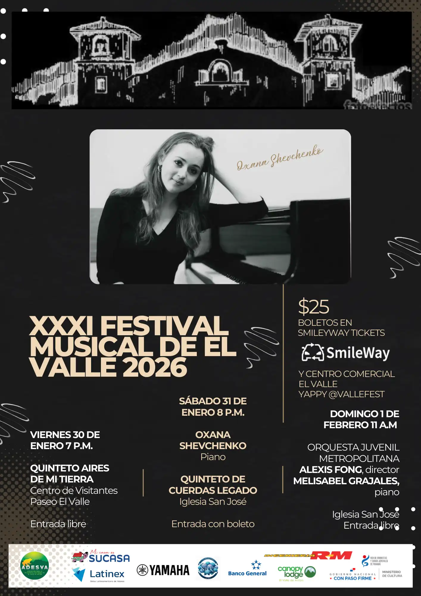 La pianista Oxana Shevchenko se presenta en el XXXI Festival Musical de El Valle de Antón con un programa de obras de Chopin, Brahms, Debussy y Rachmaninoff y el Quinteto de cuerdas Legado, dirigido por el Dr. Ricardo Zúñiga, interpretará música de Roque Cordero, William Grant, Samuel Robles y George Onslow.